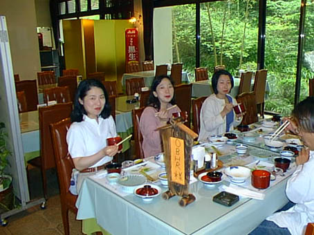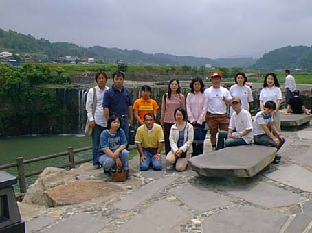 「東洋のナイアガラ」と言われる滝の前で記念撮影